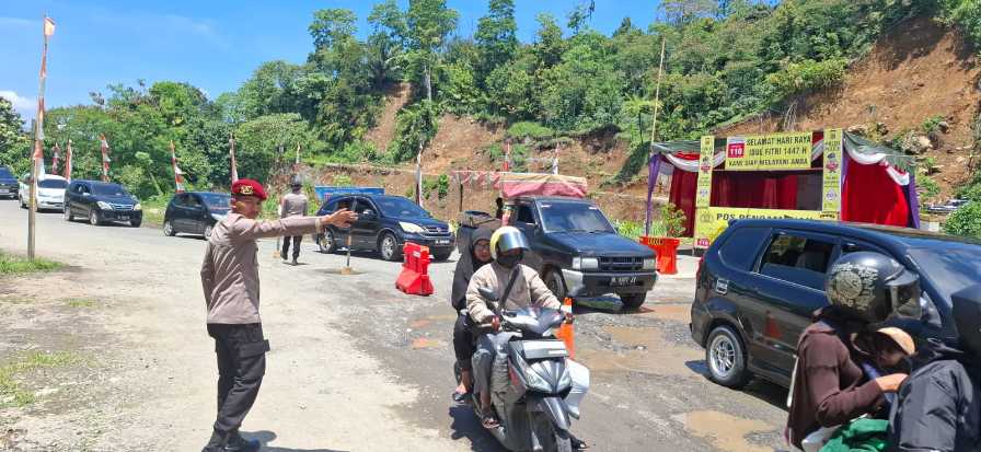 Pengaturan lalu lintas dilakukan oleh empat personel Pospam yang bertugas di lokasi. Langkah ini diambil sebagai upaya memastikan kendaraan roda dua maupun roda empat tetap dapat melintas secara aman di jalur tersebut.