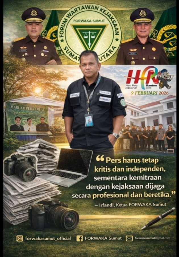 Memperingati Hari Pers Nasional (HPN) 2026, Ketua Forum Wartawan Kejaksaan (FORWAKA) Sumatera Utara, Irfandi, menegaskan bahwa pers harus tetap kritis dan independen dalam menjalankan fungsi kontrol sosial sebagaimana dijamin dalam Undang-Undang Nomor 40 Tahun 1999 tentang Pers.