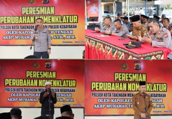 Kapolres Aceh Tengah AKBP Muhamad Taufiq, S.I.K., M.H., meresmikan perubahan nomenklatur Polsek Kota Takengon menjadi Polsek Kebayakan dalam sebuah kegiatan yang digelar di Mapolsek setempat, Selasa (10/3/2026).