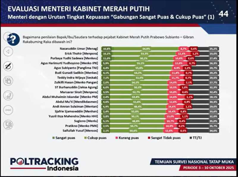 Berikut menteri dengan tingkat kepuasan tertinggi berdasarkan Survei Poltracking Indonesia, 3 – 10 Oktober 2025 terhadap 1.220 responden:
