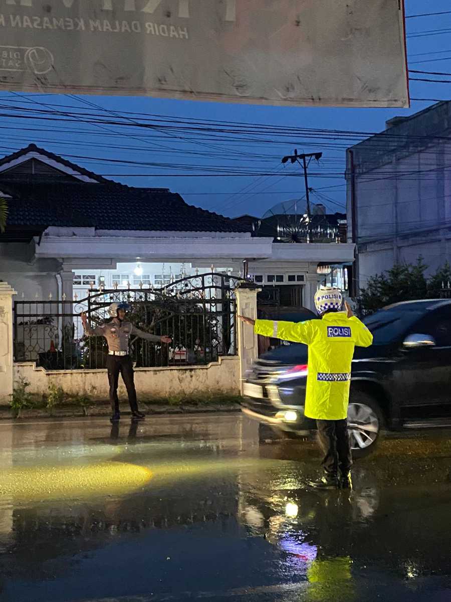 Meski diguyur hujan dan udara terasa menusuk tulang, para personel tetap sigap mengatur lalu lintas demi kelancaran mobilitas masyarakat yang masih beraktivitas pada jam tersebut.