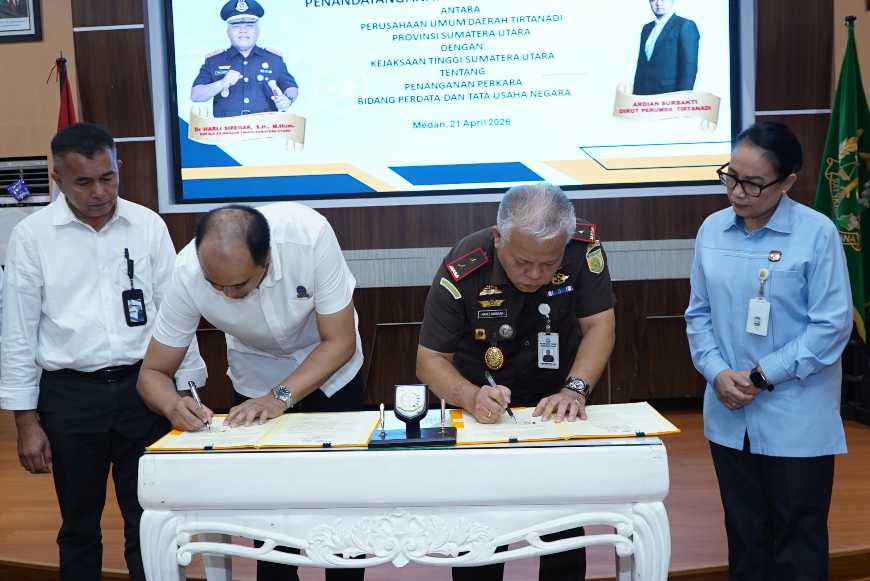 Perusahaan Umum Daerah Tirtanadi Provinsi Sumatera Utara menjalin kerjasama dengan Jaksa Pengacara Negara pada Bidang Perdata dan Tata Usaha Negara Kejaksaan Tinggi Sumatera Utara dengan penandatanganan perjanjian kerjasama (PKS) yang berlangsung di Aula Cipta Kerta lantai III Jalan Jenderal besar AH Nasution Medan pada Selasa 21 April 2026.