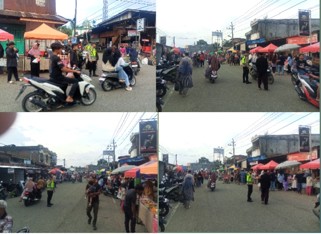 Personel Polsek Pintu Rime Gayo melaksanakan kegiatan pengamanan dan pengaturan lalu lintas di kawasan Pasar Takjil Blang Rakal, Kecamatan Pintu Rime Gayo, Kabupaten Bener Meriah, Jumat (20/2/2026).