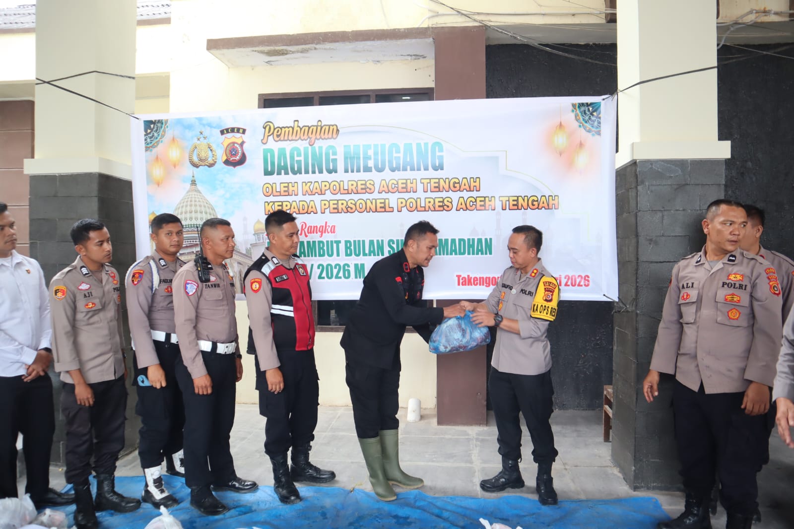 Dalam rangka menyambut bulan suci Ramadhan 1447 H, Polres Aceh Tengah menggelar kegiatan pembagian daging meugang kepada personel dan sejumlah penerima lainnya di Mapolres Aceh Tengah, Senin (16/2/2026) sekitar pukul 10.00 WIB.