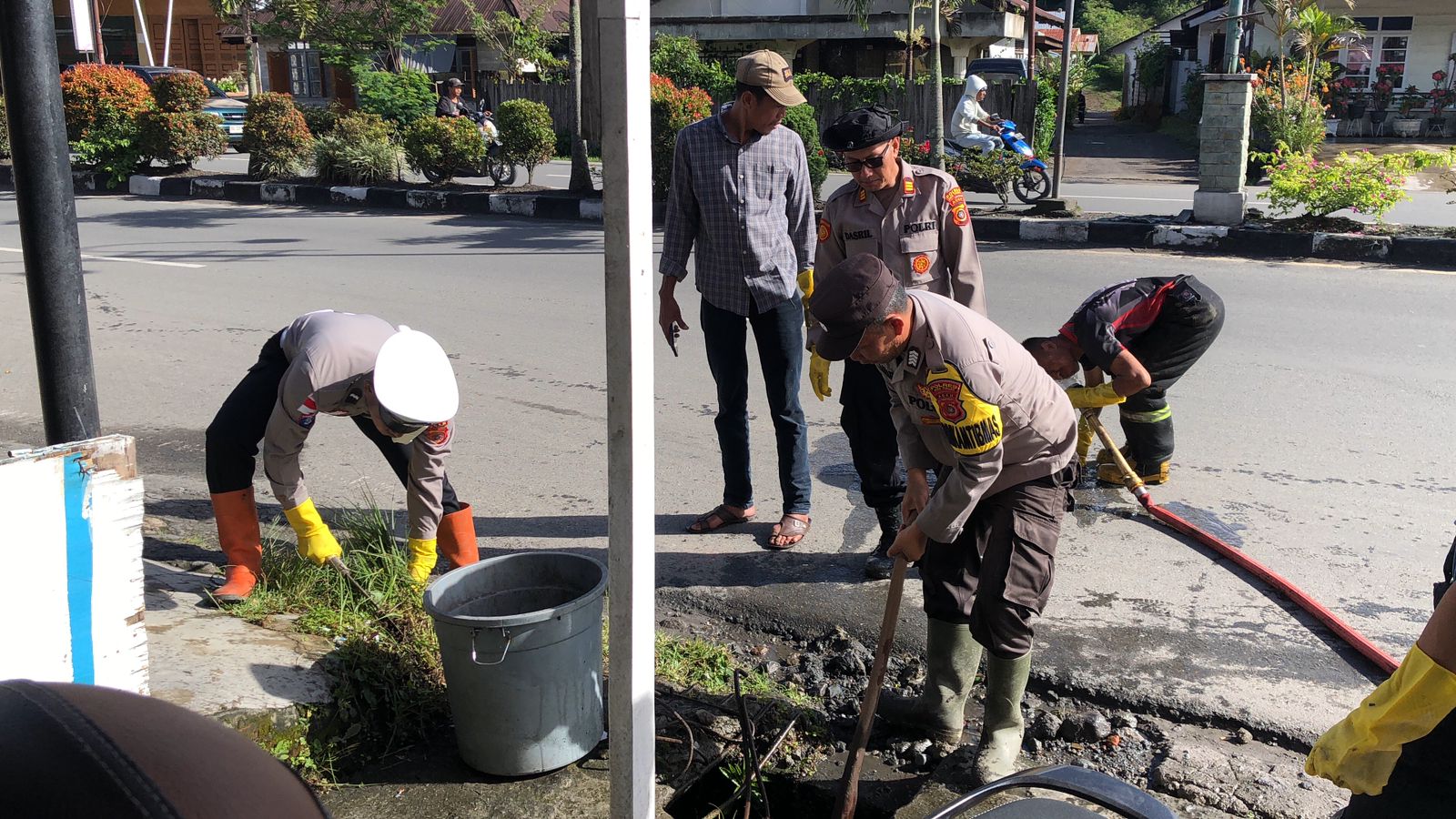 Satuan Lalu Lintas (Satlantas) Polres Aceh Tengah bersama Polsek Bebesen menggelar gotong royong pembersihan drainase di Kampung Blangkolak II, Kecamatan Bebesen, Jumat (10/4/2026) pagi.