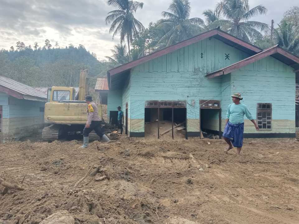 Sejak pagi hari, aktivitas pembersihan lingkungan permukiman terfokus pada sisa material tanah dan lumpur yang menutupi rumah warga akibat banjir bandang.
